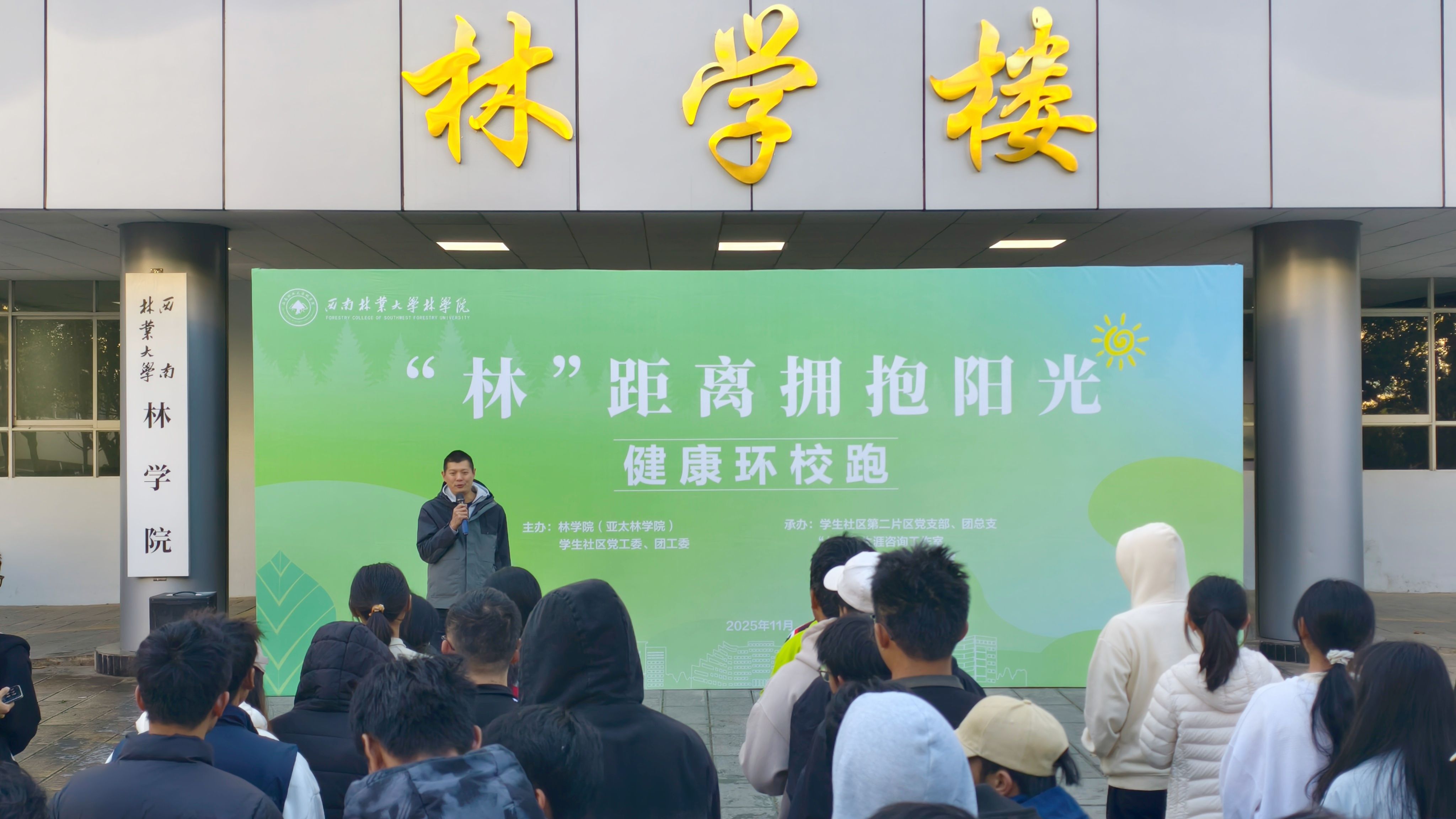 11月30日,林学院、学生社区党团工委联合主办,“绿色基因”辅导员工作室、“林翼”生涯咨询工作室承办的“‘林’距离拥抱阳光”健康环校跑活动顺利开展。林学院党委书记苏小冰、副书记李法营、第二片区片区组长、学院辅导员、班主任代表以及社区大一新生共600余人参与。