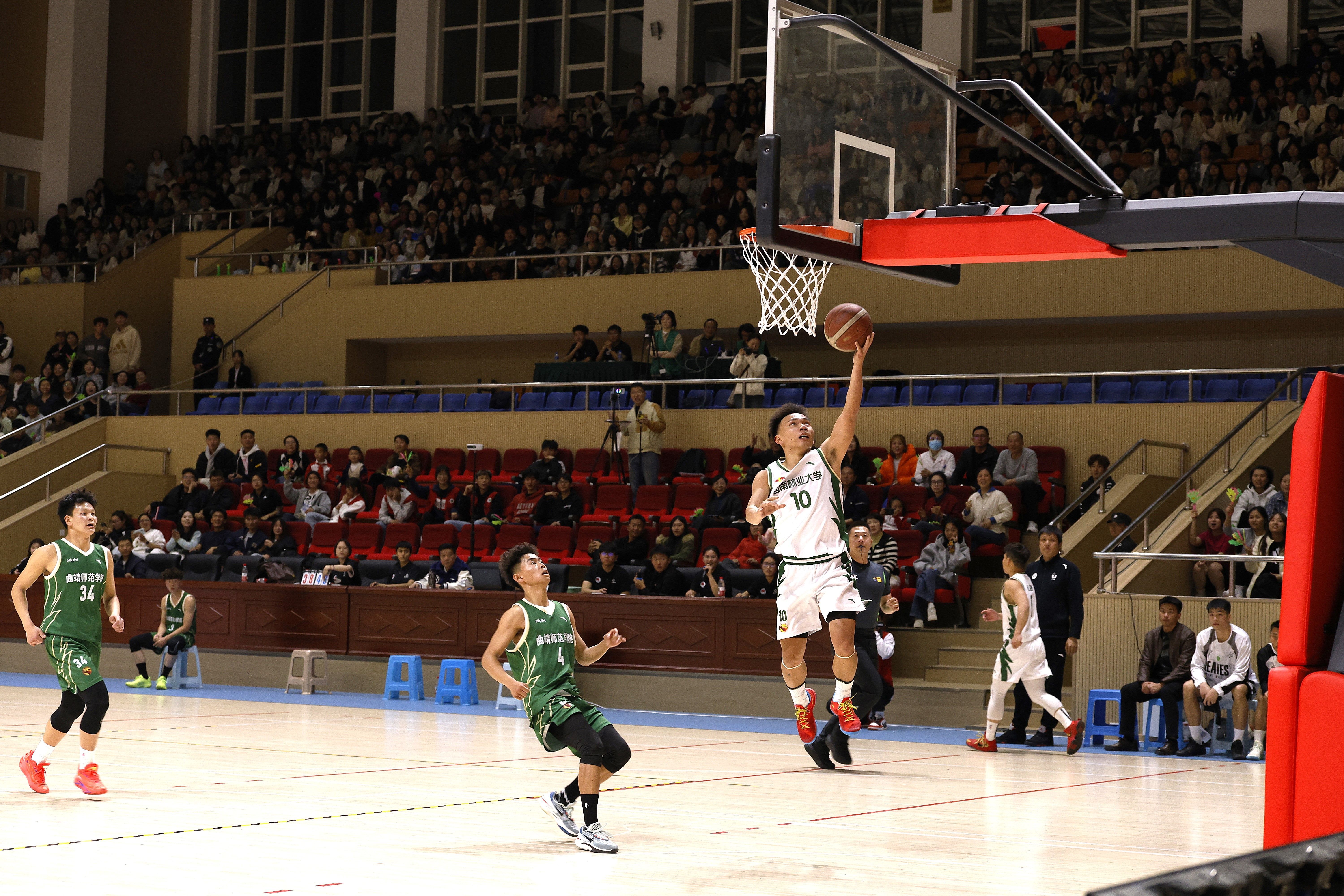 赛场上,双方球员攻防有序、配合默契,抢断、传球、投篮、封盖等动作行云流水,每一次精彩攻防都引来现场观众的阵阵欢呼与呐喊。西南林业大学男篮队员们凭借扎实的技术功底和顽强的拼搏精神,全力以赴争夺每一分,充分展现了西林学子昂扬向上、奋勇争先的精神风貌。